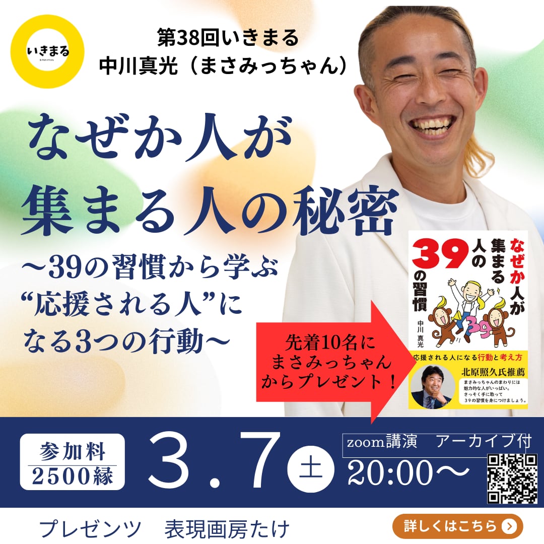 3月の【いきまる】 ゲストはいまをときめくまさみっちゃん(中川真光さん) 今回の【いきまる】の講演代の話をしたとき、 彼はこう言いました。 「たけちゃんの商品を 参加者にプレゼントして あげてください」 驚きました どこまで 人を喜ばせること 応援することを 「当たり前」に 考えているんだろう!!! その純粋な想いに感動しました そこで決めました。 講演代の代わりに、 まさみっちゃんの新刊を参加者の 先着10人にプレゼントします!! これが、彼にとっても、皆さんにとっても、 最高の「循環」になると信じて。 『なぜか人が集まる人の39の習慣』 そこには、 まさみっちゃんという「最高の人柄」が詰まっています。 2026年3月12日の発売を前に、どこよりも早く。 「やり方」の先にある「あり方」を ボクたちと一緒にインストールしませんか? 🟧第38回いきまる ゲスト:まさみっちゃん 🟧日時:3月7日(土)20時〜 🟧zoom講演 アーカイブ付 🟧参加代:2500縁 🟧特典:まさみっちゃんの新刊を先着10人にプレゼントします! 🟧詳しくはこちらを