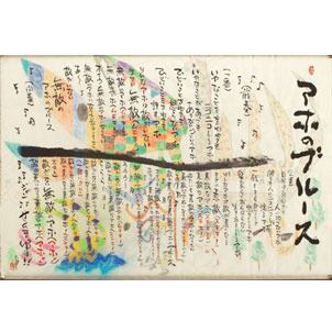いつも仲良くしてもらっている「しゅん画伯」が恐竜を描いて、その上に、たけがファーバーカステルの色鉛筆を使って、色を塗り、墨で「アホのブルース」を書きました。